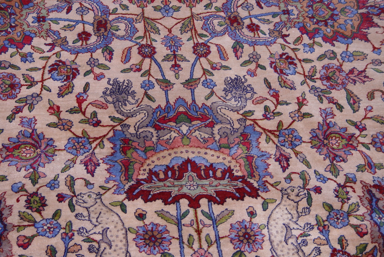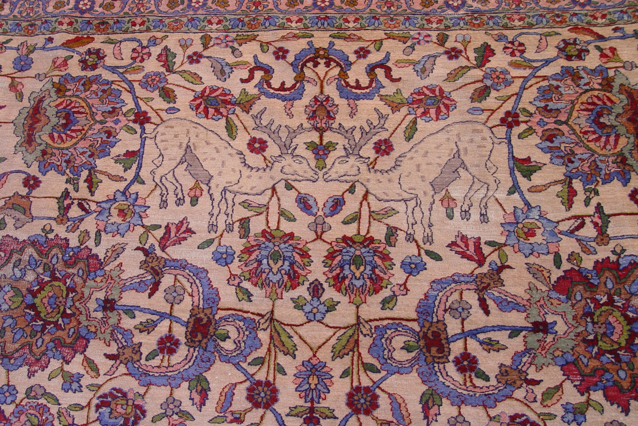 Authentic antique large oversize Persian Kashan hunting scene rug is circa 1880's-1900's. Overall the rug is in wonderful condition with respect to it age, offers a medium to low wool pile , there are some minor areas with wear but no holes , no stains, no repairs.